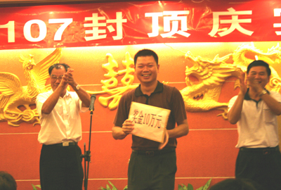 庆宴上最激动人心的时刻就是颁奖。由于鸿隆广场项目在我司项目部全体员工的共同努力下,比预计提前了13天顺利封顶,开发单位与集团公司决定对鸿隆广场项目部给予现金奖励,以资鼓励。