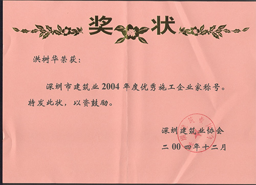 烈祝贺我司荣获“深圳市建筑业2004年度优秀施工企业”称号,洪树华同志荣获“深圳市建筑业2004年度优秀施工企业家”称号